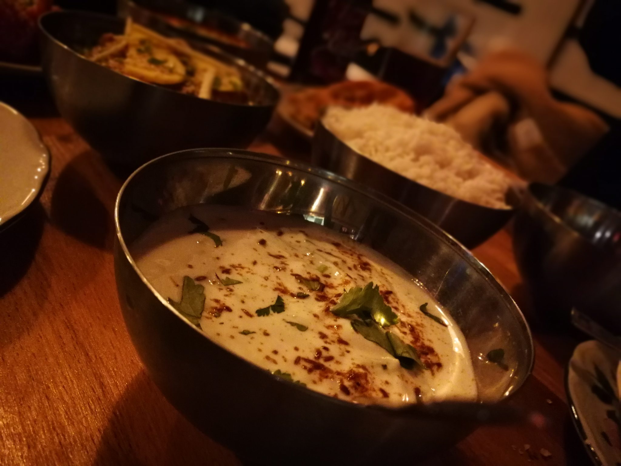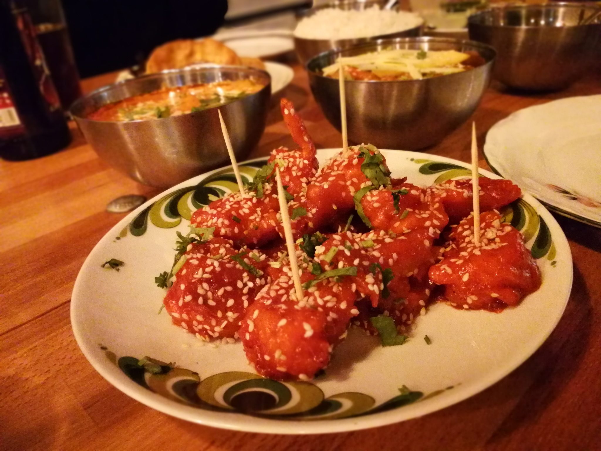 … nämlich mit dem zurecht sagenumwobenem frittiertem Blumenkohl in Sweet Chilli Marinade und Gemüse Pakora, in Kichererbsenmehl gebackenes Gemüse. Natürlich darf auch das Nan Brot nicht fehlen, mit würzig-frischem Joghurt-Kräuter-Dip und einer Linsen-Paste.