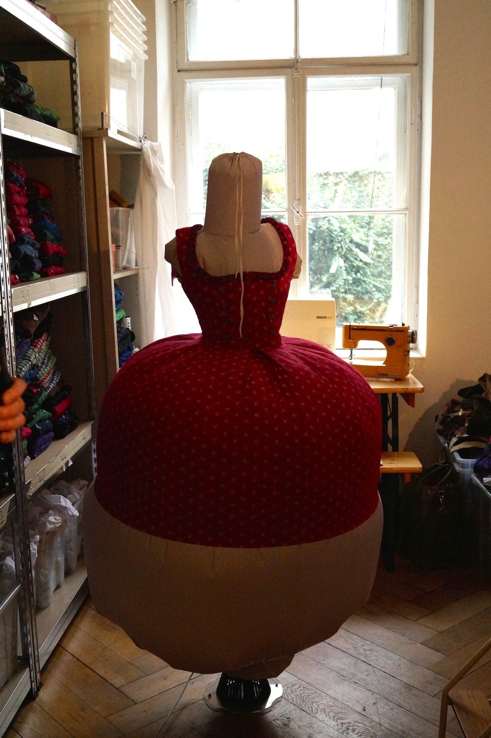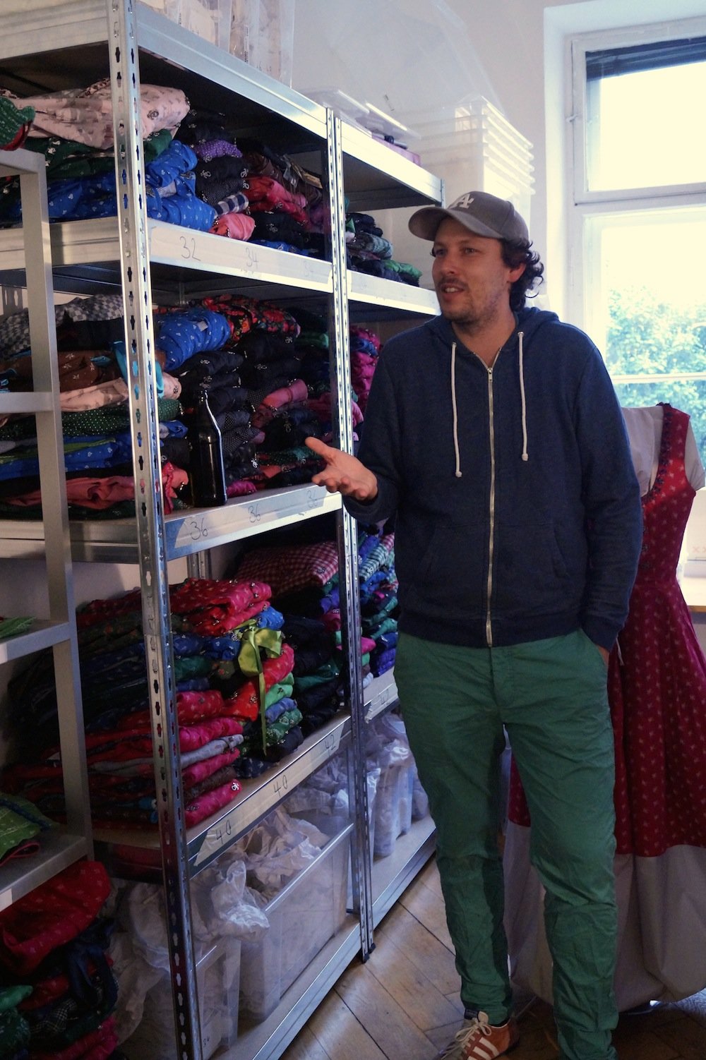 Zehn Mitarbeiter wuseln zur Saison in den drei Geschäftsräumen umher: Einer bügelt Dirndl mit der selbsterfundenen, aufblasbaren Bügelpuppe, ein Zweiter näht Knöpfe wieder an und der Dritte kämpft mit dem Lederhosenberg in der Ecke.