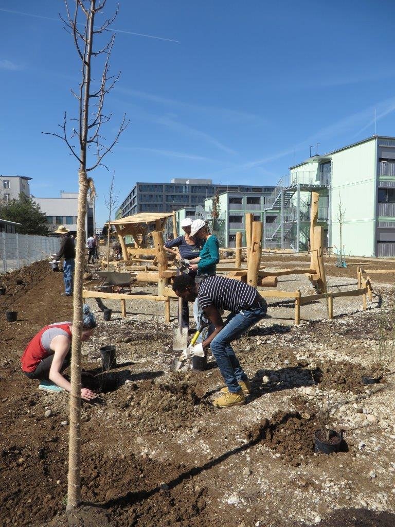 Bis es im Garten hinter der Gemeinschaftsunterkunft grünt und blüht, wird es noch ein paar Wochen dauern. Doch bereits jetzt lässt sich hier eine weitere gute Messestädter Tradition erkennen: Der Stadtteil ist nicht nur für sein bürgerschaftliches Engagement, sondern auch für seine schönen Innenhöfe bekannt. Dank der vielen freiwilligen Helfer und großzügigen Unterstützer ist die Messestadt nun um einen schönen Innenhof reicher.