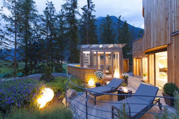 Das Gebäude passt sich, obwohl es so groß ist – es gibt 59 Zimmer – dank seiner üppigen Bepflanzung harmonisch in den kleinen Kiefernwald ein. Die Rohstoffe kommen aus der Region. Die Dämmung der Wände besteht beispielsweise aus Tiroler Schafswolle und das Apfel-, Zirben-, und Lerchenholz, aus dem das Hotel gebaut ist, kommt ebenso aus der Umgebung.