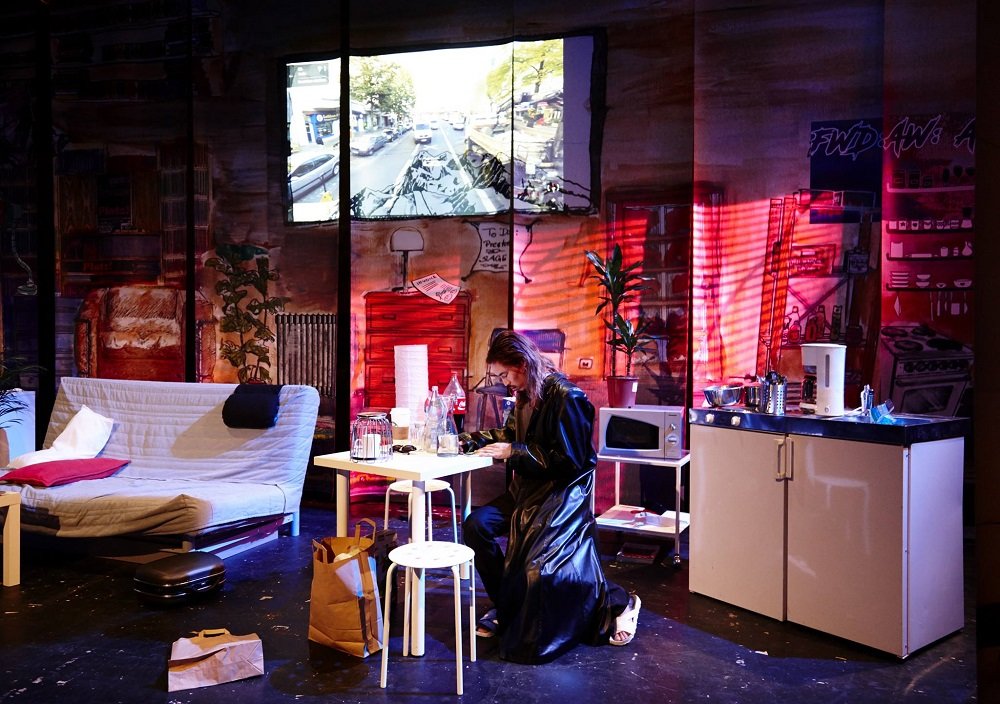 Beim Betreten der Kammer 3 fällt sofort auf, wie niedrig der Altersdurchschnitt des Publikums ist – klar, denn Medienkünstlerin Britta Thies erstes Theaterstück I’MDB – ein Live-Drama über die Tragik des Ratings spricht wahrscheinlich vor allem junge Menschen an, die berüchtigen “Twenty-Somethings”. Eine Generation, die – angeblich? – vollkommen besessen mit sich selbst und ihrem Image ist, mit Selfies, Selbstdarstellung und Selbstverliebtheit. Genau mit dieser Oberflächlichkeit, mit der Obsession, wie man wohl auf andere wirken könnte, spielt Thie in ihrer aktuellen Produktion I’MDB. Der New Yorker Modelcaster Preston und sein Mitbewohner Sage vermieten ihr hippes kleines Appartment an Touristen, die den “authentischen”, den “wahren” Flair der Kreativszene des Big Apple hautnah erleben möchten. Ihren eigenen Lifestyle vermieten die jungen New Yorker also einfach gleich mit – einen Lifestyle, der einem ewigen Kampf um Airbnb-Empfehlungen, Facebook-Likes, Twitter-Followern und Pseudo-Individualismus gleicht.