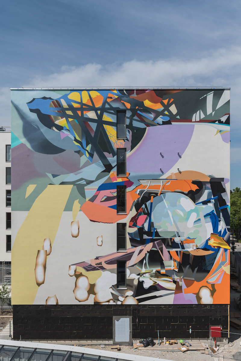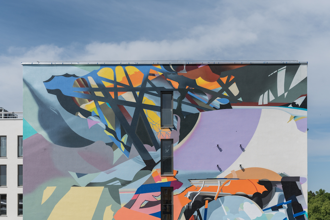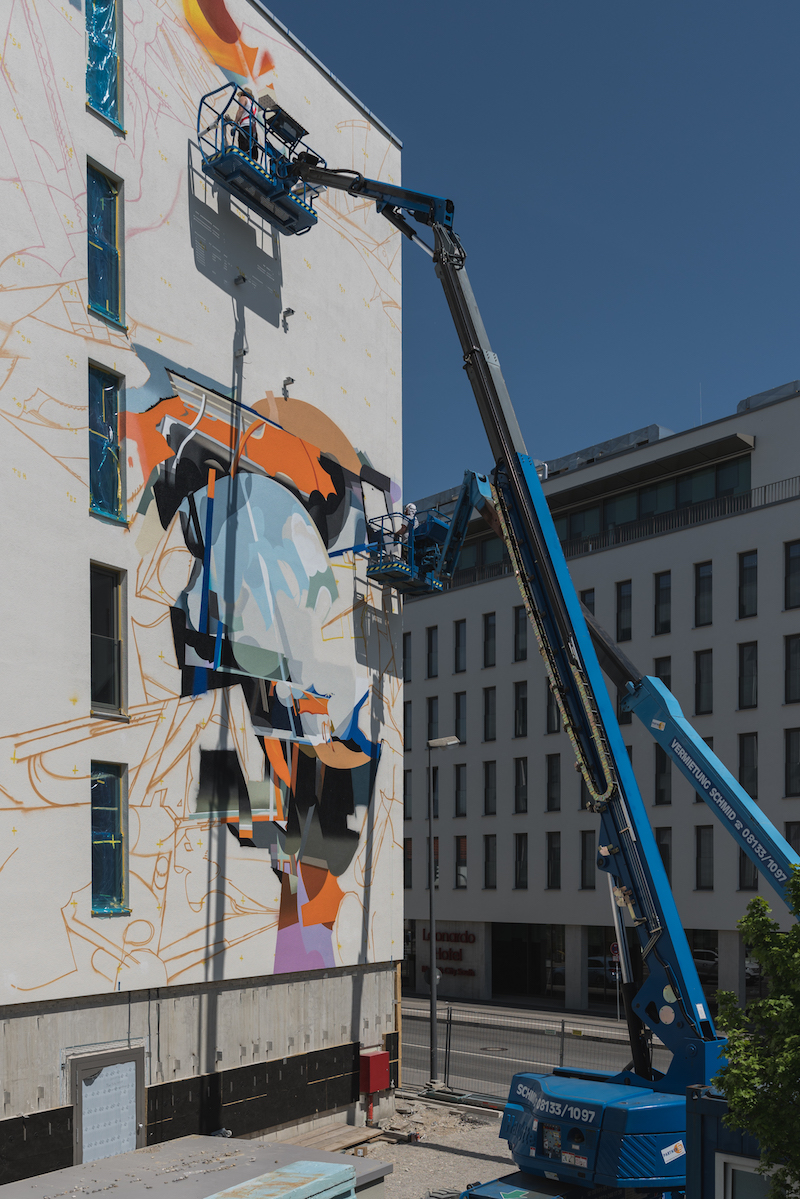 München ist um eine bunte Fassade reicher (Obersendling um genau zu sein). Hier haben die Münchner Streetart-Künstler SatOne und Daniel Man die Fassade des NYX-Hotels auf 600m2 bemalt. Sie sehen das Werk als „Intervention und als Kontrast in einer Umgebung, die von monotonen Flächen und harten Linien der umliegenden Architektur geprägt ist“.
