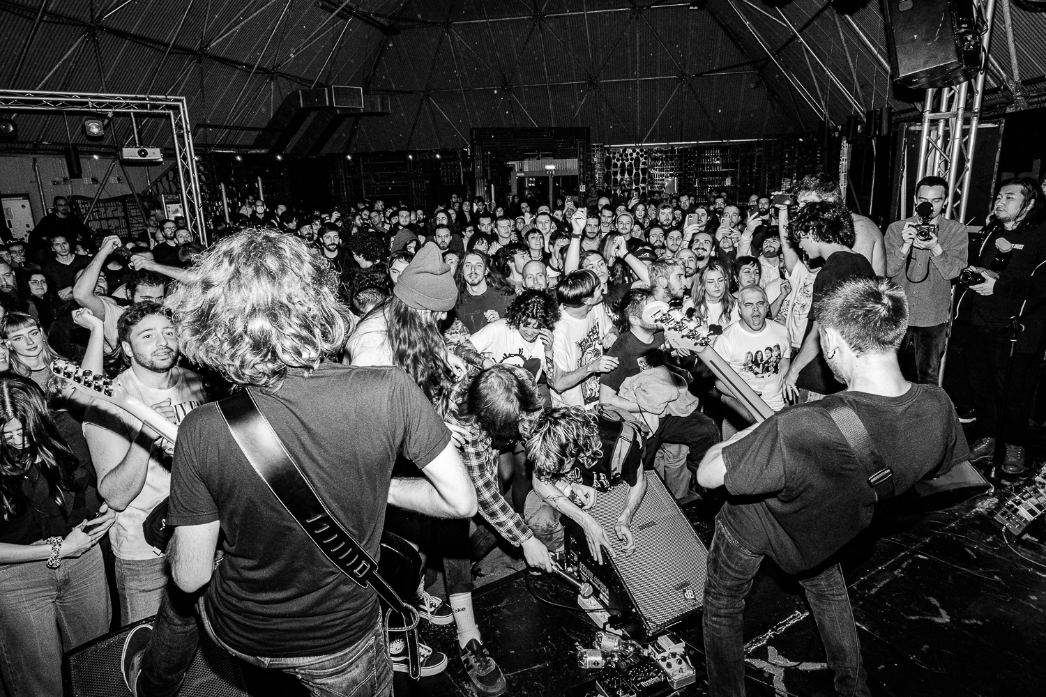 Schöne Frage! Der Großteil unserer Shows findet am Boden statt – nicht auf Bühnen. Wir wollen weg von der frontalen Trennung zwischen Band und Publikum. Lieber, wenn sich alle gemeinsam um die Musik versammeln. Auch inhaltlich stellen wir uns gegen Headliner-orientierte Abläufe: Es soll keine Haupt- und Vorband geben. Stattdessen sollen sich die Sets ergänzen, ineinander übergehen – nicht hierarchisch, sondern organisch. Gern auch an Orten, an denen man keine Bands erwartet – wie etwa auf dem Dancefloor eines Nachtclubs.