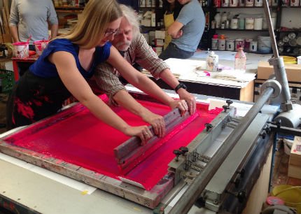 Wir Teilnehmer durften auch selbst Hand anlegen und einen eigenen Bogen in Tagesleuchtfarben bedrucken. Was einfach aussieht, erfordert ein hohes Maß an Konzentration und die richtige Mischung aus Druck und Feingefühl, um den Bogen gleichmäßig mit dem Rakel zu bedrucken. Herr Götze gab Tipps und legte auch selbst mit Hand an, um seinen Schützlingen zu einem schönen Bogen zu verhelfen.