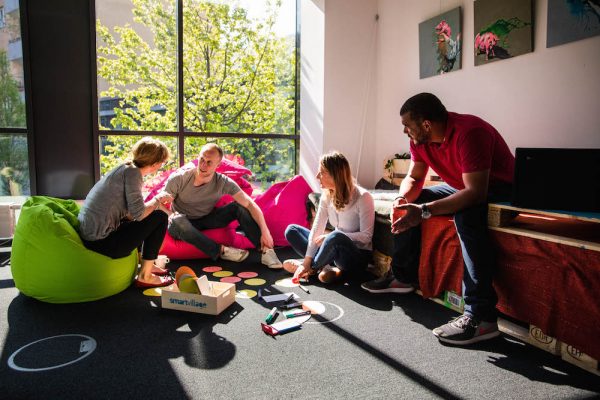 Lukas beschreibt das Arbeiten im Smartvillage so: “Unser Fokus ist auch nicht das klassische Coworking im Sinne von “ich komme mal einen Tag ins smartvillage und schlage meinen Laptop auf”, sondern wir vermieten tageweise unsere sieben Räume von 2 – 170 Personen, an Innovationsteams aus Großkonzernen oder Agenturen und Startups.