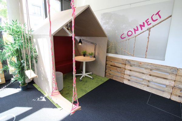 Es gibt zahlreiche Sitzmöglichkeiten, darunter Sofas, Hocker aber auch Schaukeln. Frei nach dem Motto: raus aus dem miefigen Büroalltag, rein ins kreative Smartvillage. Hier kann vorgestellt, entwickelt und diskutiert werden. Klar stehen dafür allerhand Tools zur Verfügung: Whiteboards, Pinnwände, Beamer, Stifte und Zettel liegen bereit.