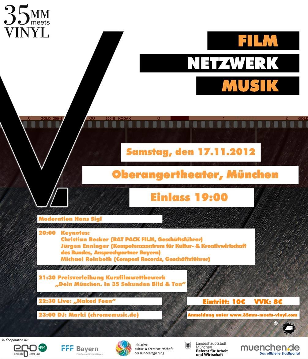 Das jährliche Event dient dem Networking und fachlichen Austausch der Branchenvertreter mit der Intention, neue Projekte durch den informellen und persönlichen Dialog von Berufseinsteigern und Experten anzuregen. 35mm meets Vinyl versteht sich als authentische non-elitäre Plattform, deren einzige Währung qualitativ hochwertige Ideen sind. Auch dieses Jahr können sich die Gäste wieder auf ein ansprechendes inhaltlich wertvolles Programm freuen. Dazu gehören dieses Mal drei spannende Gastredner der Musik- und Filmwirtschaft, die jeweils eine 15-minütige Keynote halten werden, die Preisverleihung zum Kurzfilmwettbewerb “Dein München. In 35 Sekunden Bild & Tonâ€, Live Musik und natürlich der anschliessende Netzwerk- und Party-Teil des Abends.
