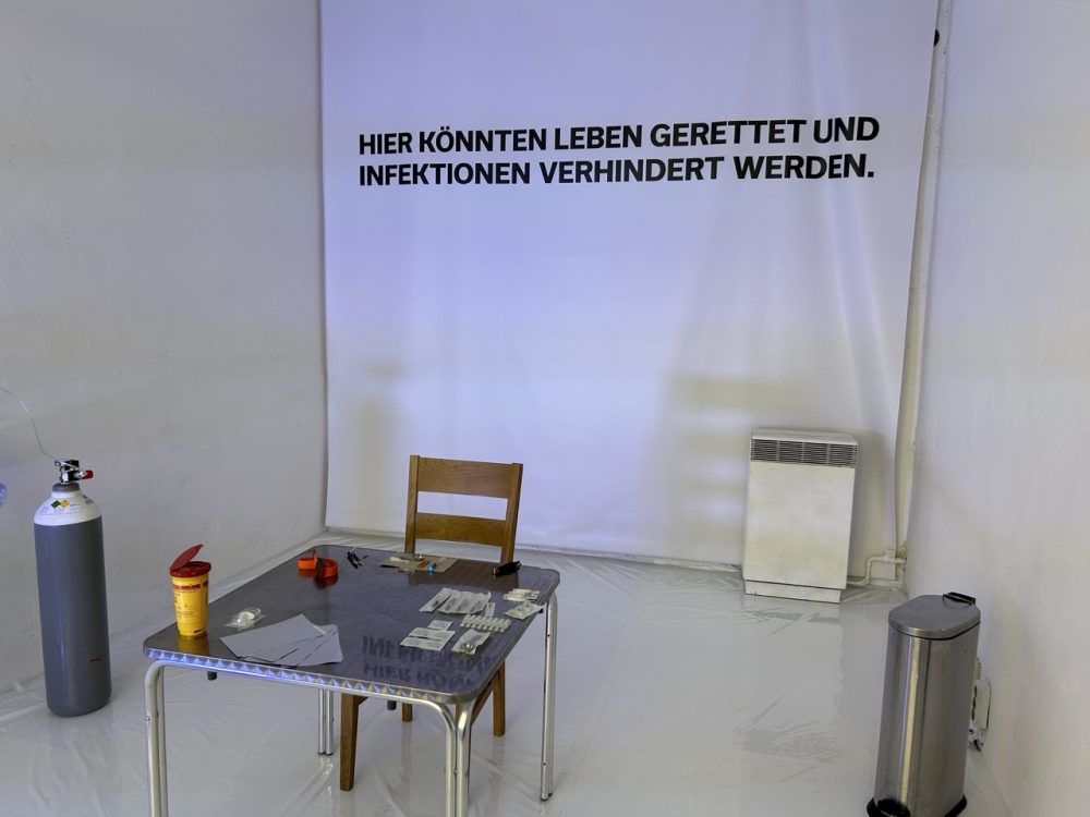 Auf der Frauenhofer Straße inmitten eines weiß ausgekleideten Raums, steht ein silberner Metalltisch. Darauf liegen Spritzen, ein Gurt zum Abbinden, ein Feuerzeug, ein Löffel. Der Tisch ist so sauber poliert, dass sich die Schrift an der Wand in ihm spiegelt: “HIER KÖNNTEN LEBEN GERETTET UND INFEKTIONEN VERHINDERT WERDEN”, steht in schwarzen Großbuchstaben an der weißen Wand. Die Kunstaktion soll einen Drogenkonsumraum darstellen. Der Raum soll während der Dauer der Welt-AIDS-Konferenz mahnen, dass Konsumräume fehlen.