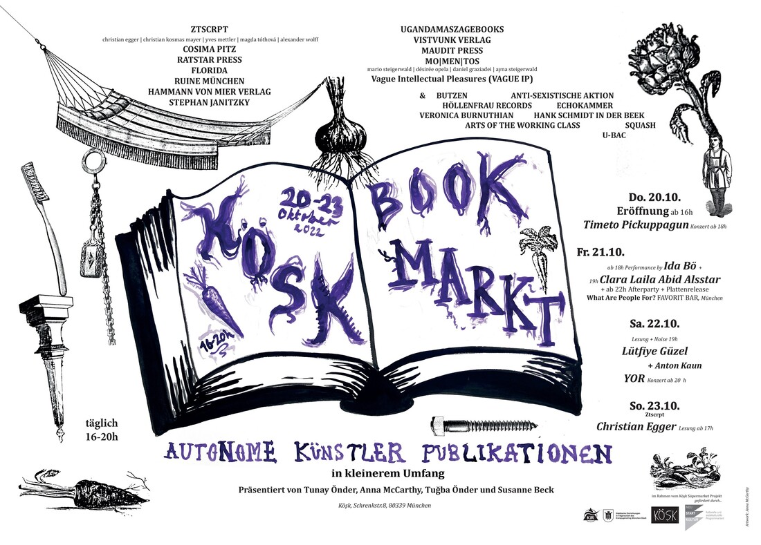 Stephan Janitzky, Hammann von Mier Verlag, Ztscrpt (Christian Egger, Christian Kosmas Mayer, Yves Mettler, Magda Tóthová und Alexander Wolff), UgandaMaszageBooks, Cosima Pitz, Florida, Vistvunk Verlag, Maudit Press, Ruine München, mo|men|tos (mario steigerwald | désirée opela | daniel graziadei | ayna steigerwald), Vague Intellectual Pleasures (VAGUE IP); Ida Bö, Echokammer, Arts of the Working Class, Hank Schmidt in der Beek, Ratstar Press, Höllenfrau Records, Veronica Burnuthian, Squash, U-BAC, BUTZEN, Antisexistische Aktion