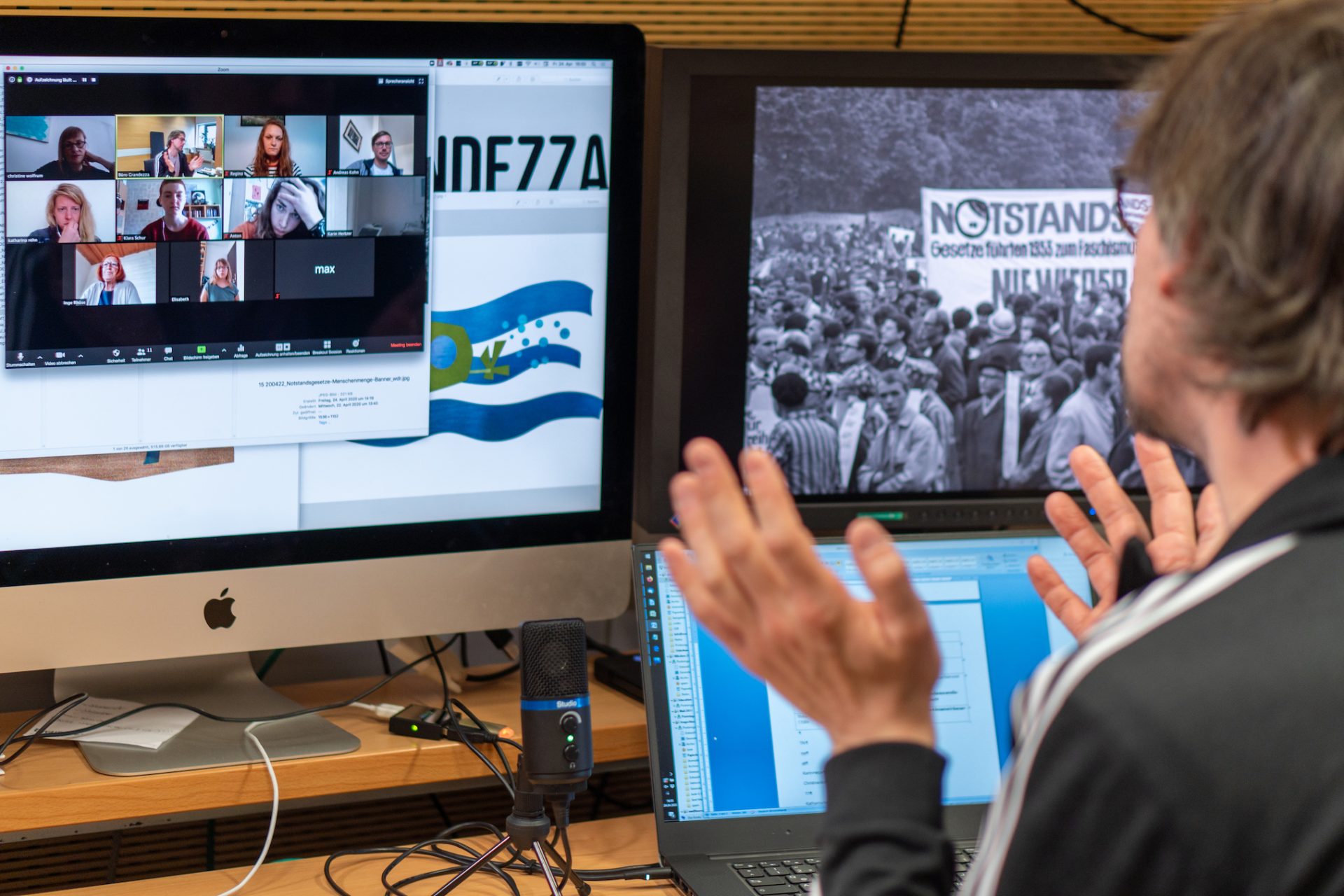 Falls es regnet oder der Weg zu weit ist, alternativ jeweils von zu Hause aus mittels Videokonferenz (via Zoom; die Internetadresse und technische Unterstützung beim Einrichten von Mobiltelefon oder Computer bekommen Sie von uns, sobald Sie sich angemeldet haben).