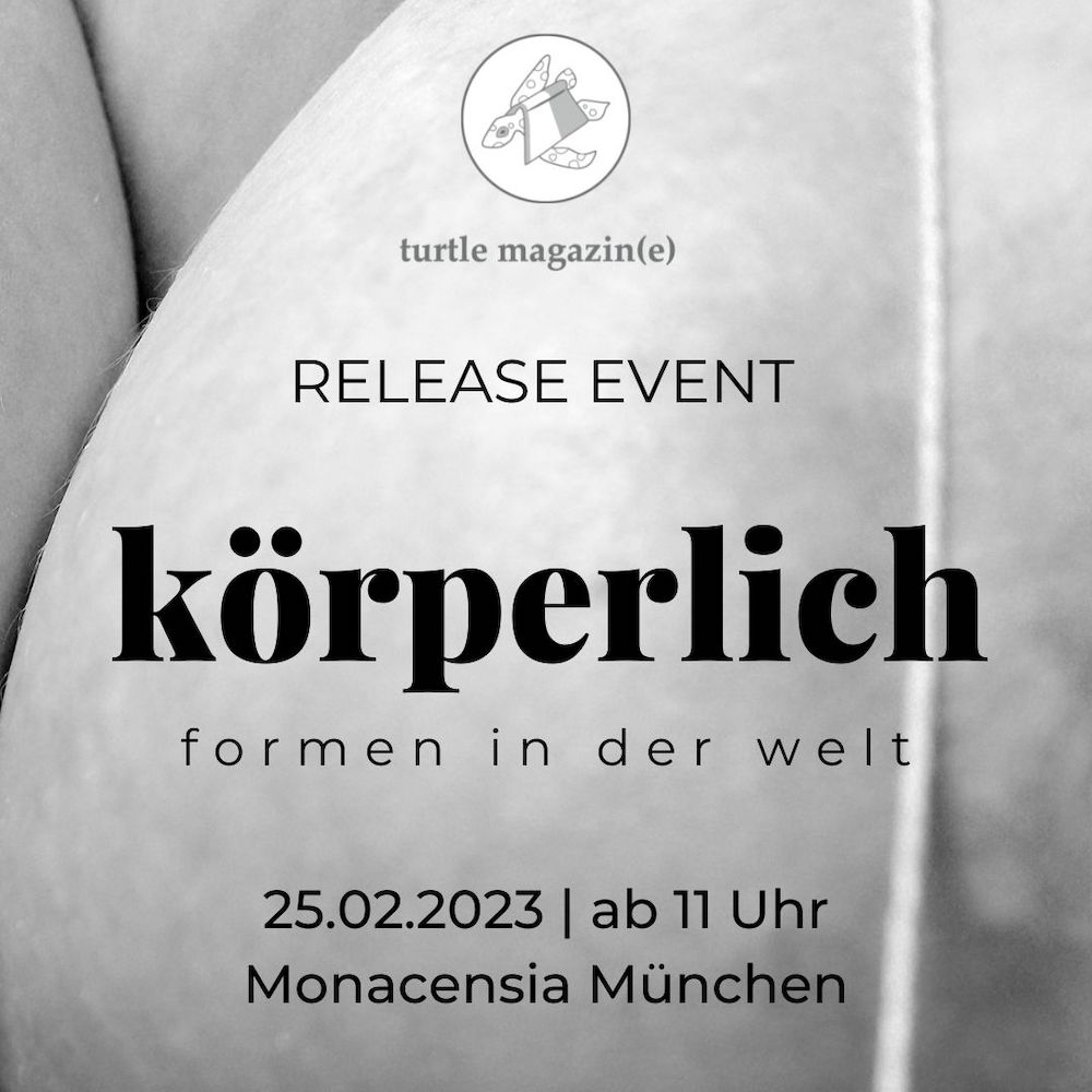 Am Samstag, den 25.02.2023 erscheint bereits die vierte Ausgabe vom turtle magazin(e). Diesmal zum Thema “körperlich: Formen in der Welt” – wir feiern das mit einem großen Release Event in der Monacensia im Hildebrandhaus!