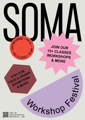 Ein Tag voller Inspiration, Kreativität und Austausch: Am Samstag, den 9. Dezember 2023 geht SOMA mit dem ersten interdisziplinären Workshop-Festival im ZIRKA München in eine neue Runde. Den Teilnehmenden wird über den Tag verteilt eine Vielzahl an Workshops angeboten, die diverse Themengebiete behandeln, für Personen verschiedener Altersgruppen/ Interessenbereiche gleichermaßen spannend sein können und für die keine Vorkenntnisse benötigt werden.