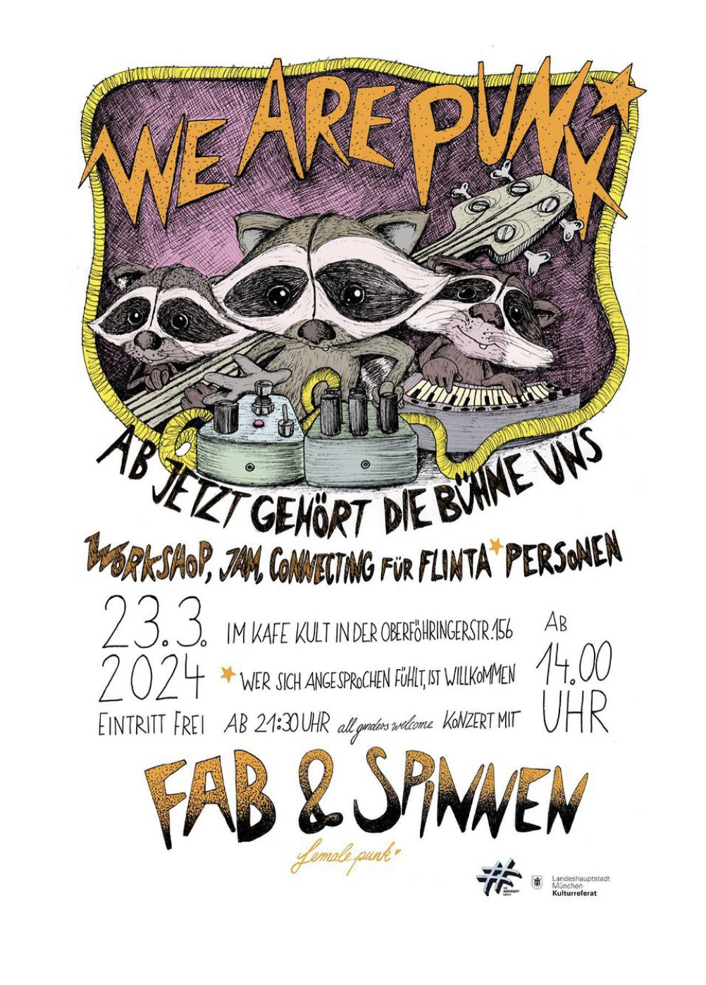 We are Punk* – Ab heute gehört die Bühne uns! Unter diesem Motto möchten wir Flinta*- Personen motivieren Punkmusik zu machen. Denn Punk war schon immer DIY und jede*r kann Punk! Die Punkszene ist weiterhin sehr endro- cis-männlich dominiert, doch an unserem Flinta* Punktag wollen wir all jene empowern sich die Bühne zu nehmen und zu lernen, zu üben, zu connecten und zu performen, die sonst seltener vertreten sind. Kommt vorbei, denn WE ARE PUNK* Als Anlass unseres Projekts sehen wir übergeordnet den Wunsch Hürden für Flinta* Personen in der Musik durch eine gegenseitige Vernetzung zu verkleinern. Diese Hürden reichen von den Zugängen