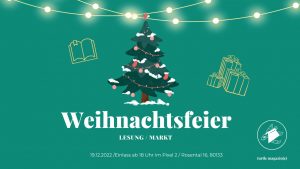 „Wir, das turtle magazin(e) möchten herzlich zur Weihnachtsfeier und Winterlesung am Montag, den 19.12.2022 im Pixel 2, Rosental 16, 80331 München ab 18:00 Uhr einladen. Wir möchten gemeinsam mit euch das Jahr beenden, winterlichen Texten und Musik lauschen, Glühwein trinken, Plätzchen essen und ins Gespräch kommen. Außerdem wird es einen kleinen Weihnachtsmarkt geben bei dem ihr noch...