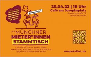 Find out more »Der Münchner Mieter*innenstammtisch ist eine offene Plattform zur Vernetzung der Bewohner dieser Stadt. Sie dient dem Austausch untereinander, schafft Zusammenhalt und Wahrnehmung. Durch Eigeninitiative kann man sich gegen den Mietenwahnsinn organisieren und wehren. Programm: Mieter:innenkämpfe in der Maxvorstadt von den 70ern bis heute Was hat sich seit...