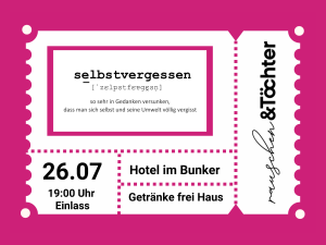 #selbstvergessen Wann? 26.07.2023, Ab 19:00 Einlass, Beginn 19:30 Wo? Hotel im Bunker, Lautenschlägerstraße 26, 80999 München Wir lieben Literatur, Feminismus und junge aufregende Stimmen! Das wollen wir mit euch bei einem lauschigen Sommerabend auf einer romantischen Dachterrasse zelebrieren! Seid dabei, wenn vielseitige Texte gelesen werden,...