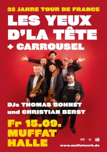 Konzert: Les Yeux D’ La Tête (Paris) + Carrousel (Schweiz) Disco mit den DJs Thomas Bohnet und Christian Berst München-Muffathalle Freitag, 15.09.2023 Einlass: 19 Uhr Beginn: 20 Uhr Eintritt Vorverkauf: EUR 26,00 + Gebühren Nur Disco ab 23 Uhr: EUR 10,00