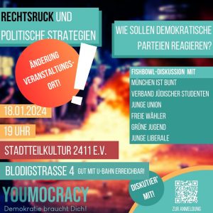 Find out more »youmocracy München, eine Münchner Studenten-Intitiative zur Stärkung der Demokratie, startet in das neue Jahr mit einer großen Veranstaltung zu einem heißen Thema. Mit einer interaktiven Fishbowl-Diskussion wollen wir mit euch Teilnehmer/innen über den Rechtsruck in Bayern und Deutschland diskutieren und der Frage nachgehen, wie demokratische...