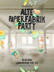 Find out more »Eine super spannende Offlocation, eine alte Papierfabrik in der Landsberger Str. 212, wird erstmals von Two In A Row zum Club gemacht! Mit überragendem Sound von 'Lambda Labs', einem fantastischen Lichtkonzept von 'Speziallicht' und unseren liebsten DJ-Freund*innen: Moritz Butschek, Silsan und mehr. Mehr Infos und...