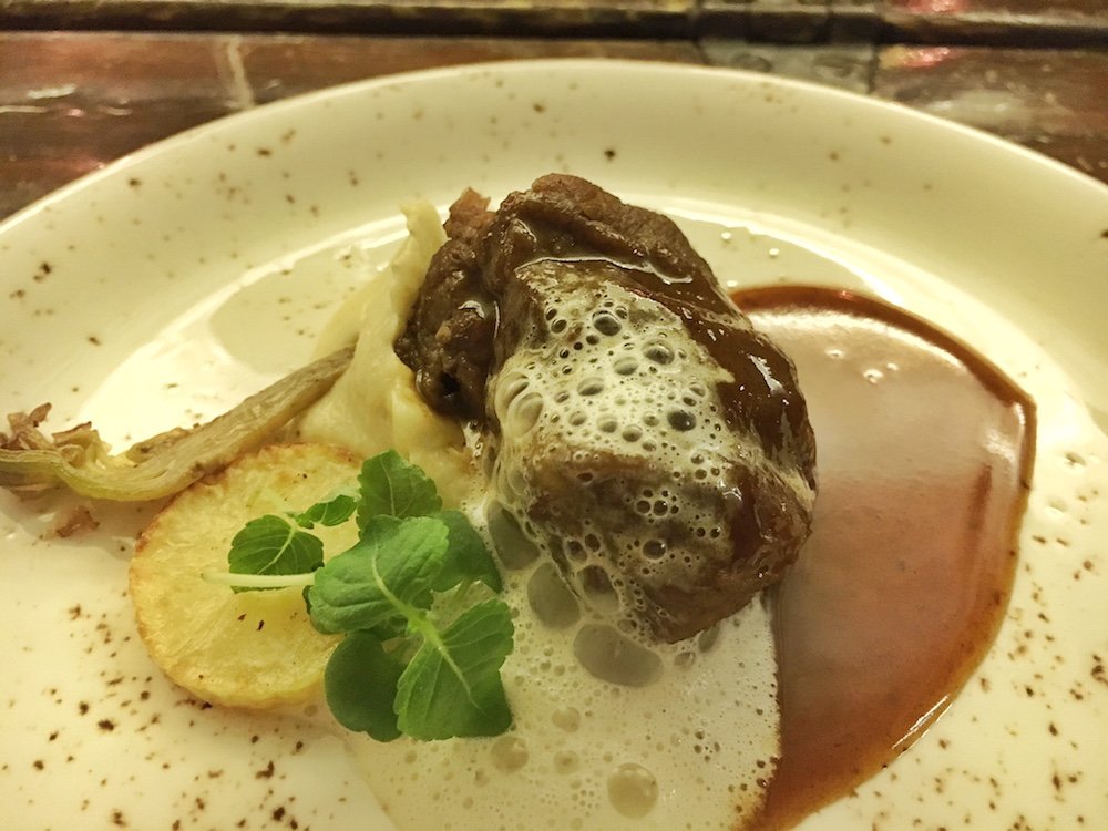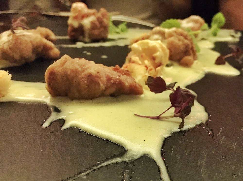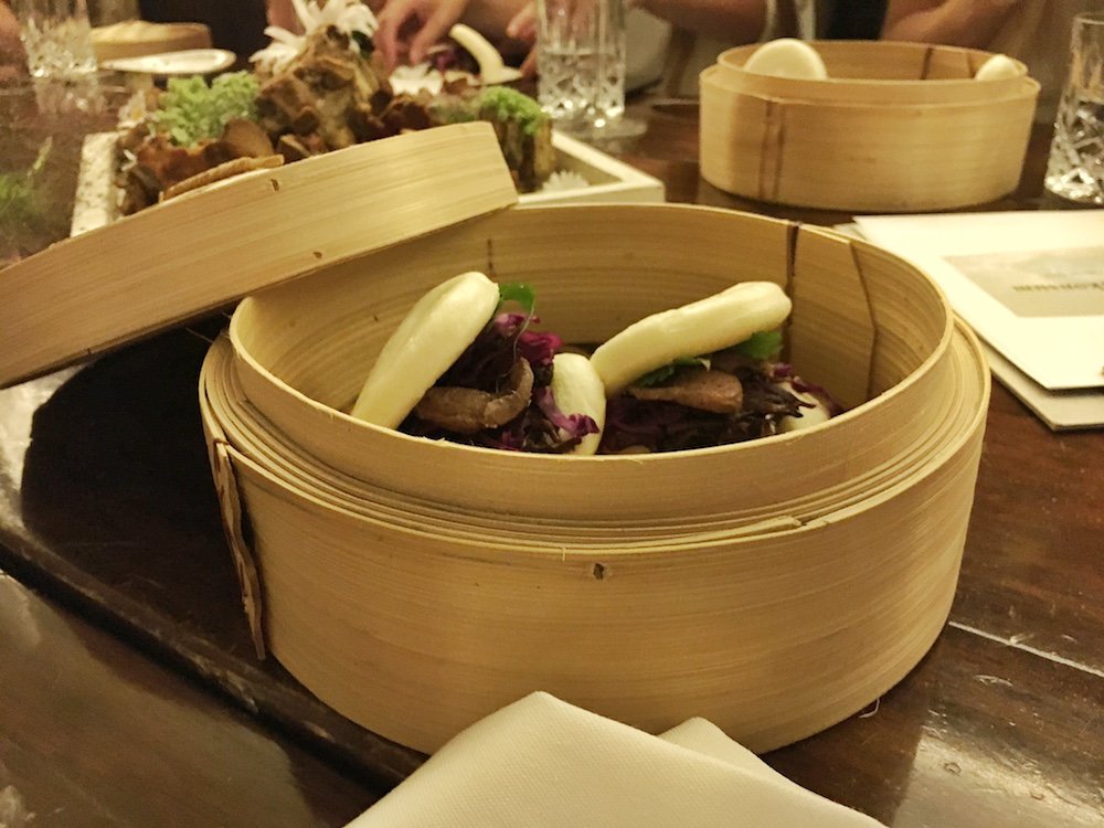 Ban Bao, gefüllt mit Brust & Herz, Ingwer, Blaukraut, Koriander und mit brauner Butter serviert, Kalbsbries mit Velouté, Flusskrebs und Kapern, gefolgt von Schweinebacke mit Madeira, Artischocken- und Selleriepüree und Kartoffel – ich sag’s euch ganz ehrlich, bestellt hätte ich mir freiwillig nichts davon.