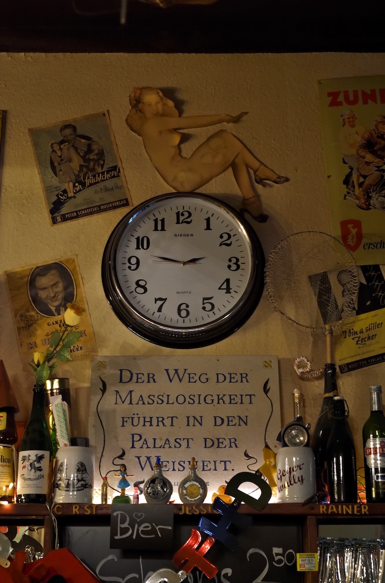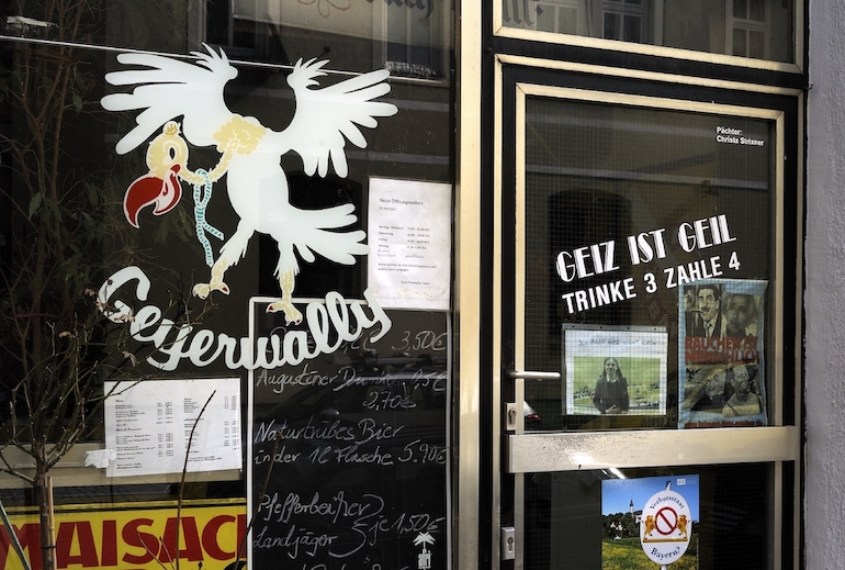 Werbeschilder und Memorabilia aus dem 20. Jahrhundert prägen das Flair der Geyerwally. Kommentare und Sticker wie „Sexistische Kackscheiße“ aber auch. Kompromiss: Auch männliche halbnackte Schönheiten hängen seit kurzem in der Kneipe.