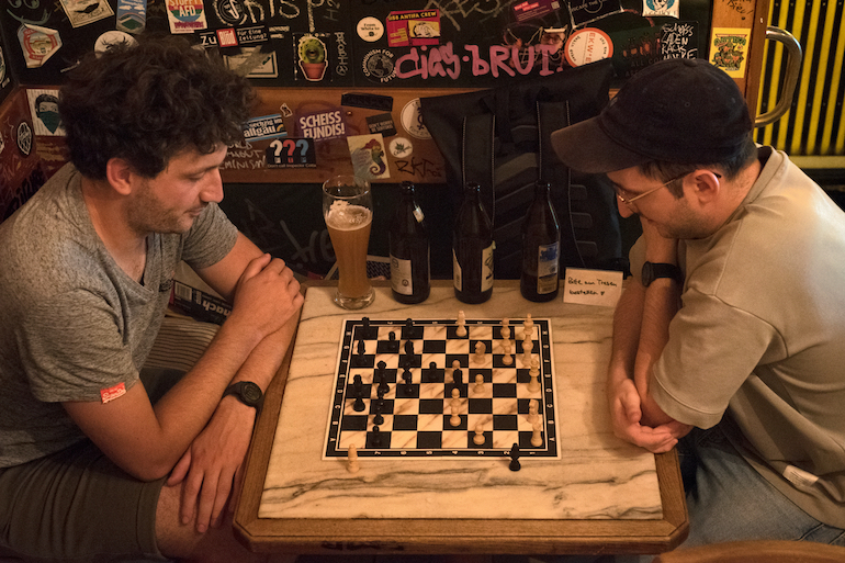 Ein klassischer Kneipensport ist Schach ja nicht. Die beiden Gäste stört’s wenig. Immerhin zählt Bier auch nicht als Doping beim Schach.