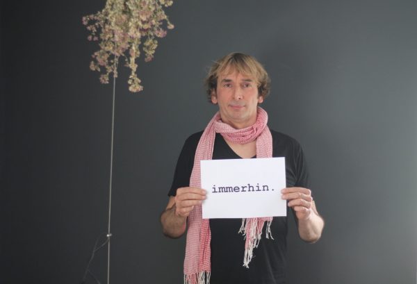 Das IMMERHIN-Prinzip steht bei dem Textkreativen im Fokus: Alles nicht zu ernst nehmen. Widrigkeiten ad absurdum führen. Und das Glück im Unglück suchen. Für seine Ausstellung hat Thomas Steierer Menschen mit IMMERHIN-Schild fotografiert und sie nach ihrer persönlichen Durchhalteparole befragt.