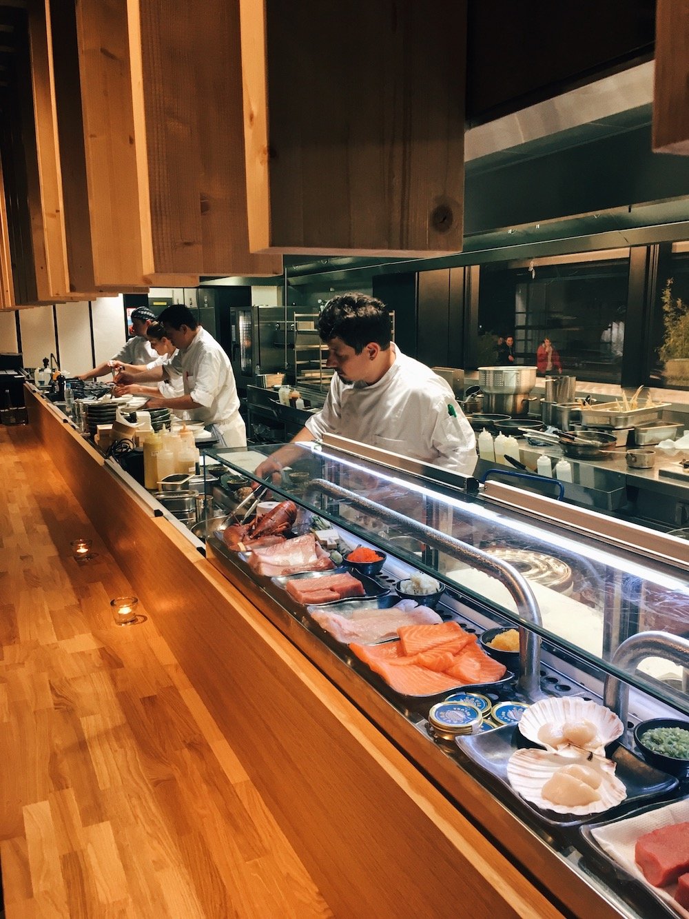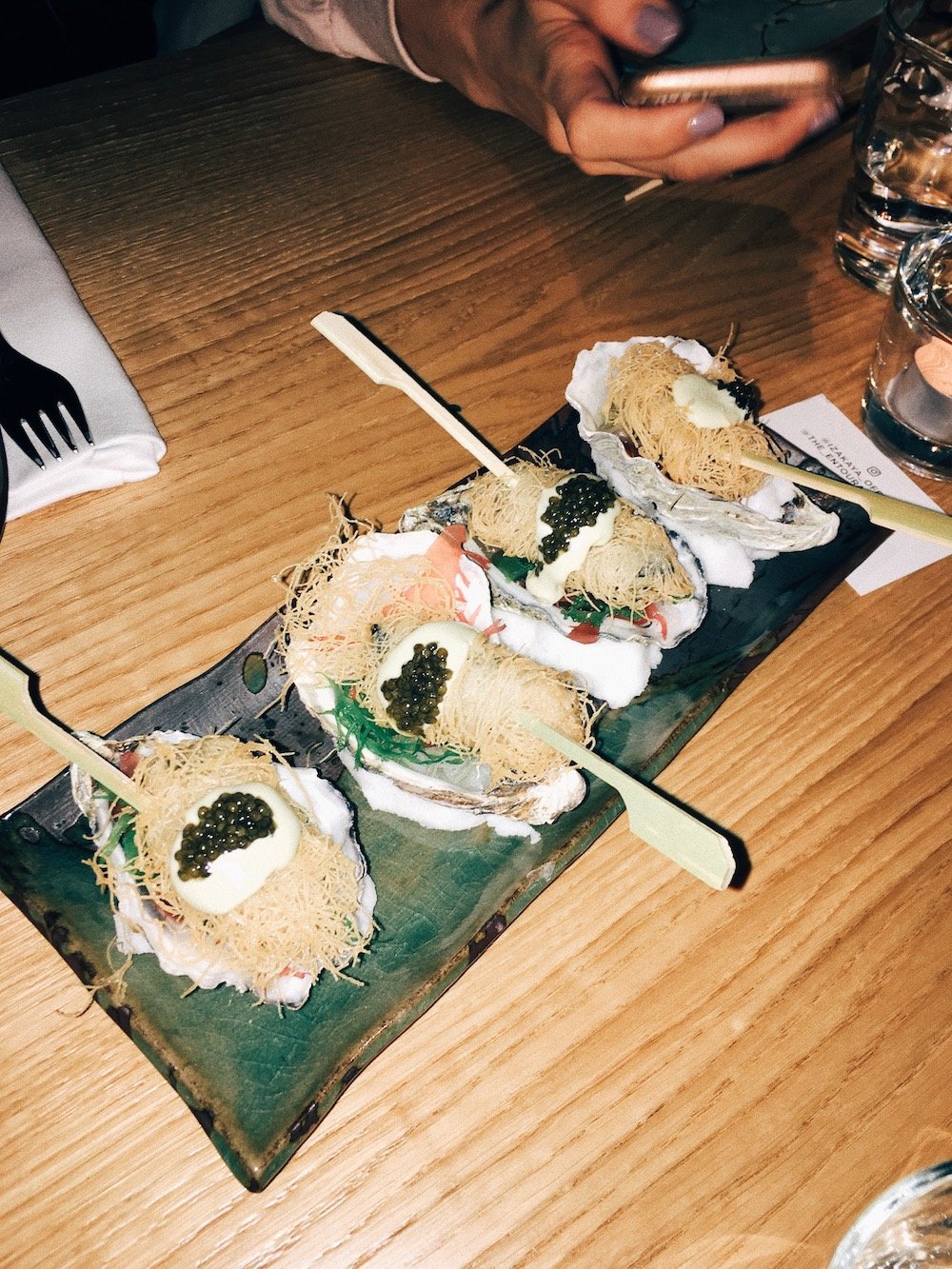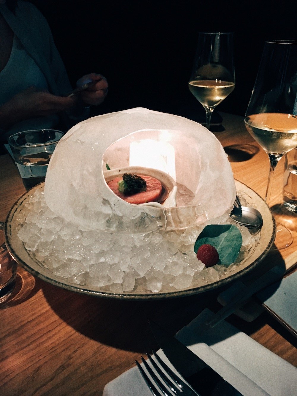 Das Menü beginnt mit Thunfisch Tatar und Beluga Kaviar, serviert in einem Eis-Iglu. Ja, Eis-Iglu. Dazu gibt es Seebarsch Sashimi in Olivenöl und getrocknetem Miso und Spinat Salat mit gegrillten Shrimps. Darauf flogen Mais Tempura, Rindfleisch Tataki mit Zwiebel-Ponzu-Soße und Knoblauch Chips, Austern im Filo Teig mit cremigem Wasabi und Beluga Kaviar und Gyoza, japanische Teigtaschen gefüllt mit Wagyu Rind und Foie Gras.