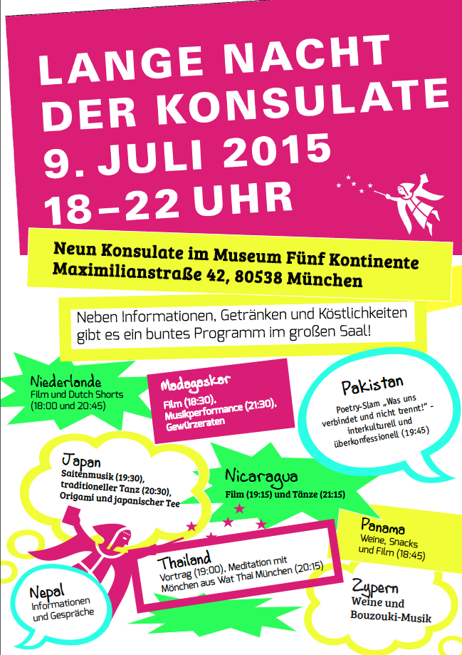 Morgen, Donnerstag, 9. Juli 2015 seid ihr zwischen 18 und 22 Uhr von den konsularischen Vertretungen in ganz München zur ersten Münchner Langen Nacht der Konsulate eingeladen!