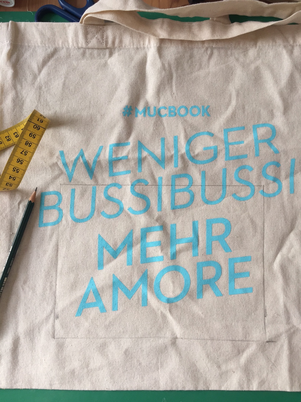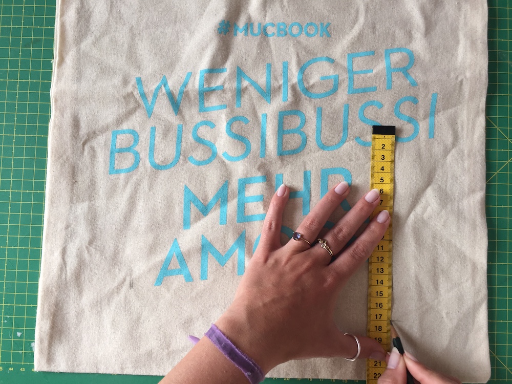 1. Aus dem MUCBOOK Jutebeutel ein Rechteck à 23x17cm ausschneiden