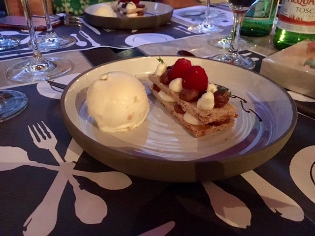 Für uns heißt es nach der Tour, selber Hand anpacken. Die eine Hälfte bereitet das Dessert zu, die andere die Vorspeise. Nach der Käseabteilung schon jetzt mein Liebelingsteil des Abends, denn ich freue mich immer, wenn ich neue Sachen lernen kann. Verspeist wird alles hinterher zusammen an einer langen Tafel. Eine Hauptspeise gibt es auch, die haben allerdings die echten Profis zubereitet für uns. Das Essen ist exzellent, der Wein auch, vor allem aber die Gespräche. Zwischen uns sitzen viele der Käferangestellten, wir ratschen und lachen, es ist egal, ob wir uns die Mieten in Bogenhausen leisten können oder nicht, es ist egal, wo wir normalerweise einkaufen, wir sind willkommen wie jeder andere auch.