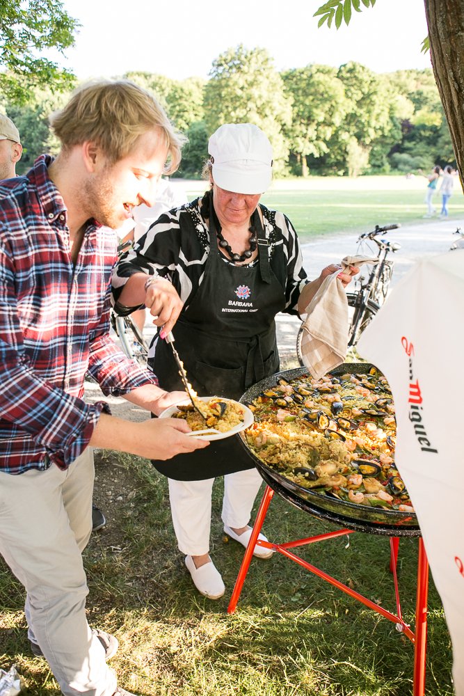 Wir hatten gleich mehrere Kästen des spanischen Biers dabei, und als dann auch noch eine spanische Köchin eine gigantische Paella-Pfanne aufbaute, zog das nicht nur neidische Blicke der anderen Grillfans auf sich, sondern auch eine Gruppe Spanier an. Ob sie ein paar cervezas haben könnten? ¡Claro que si!