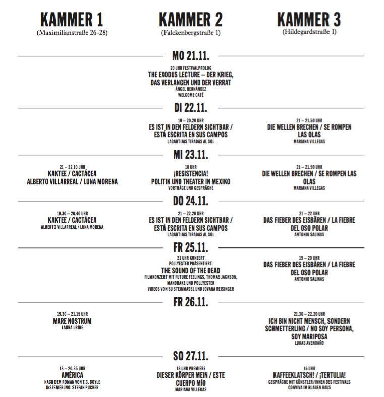 Exklusiv für das Festival hat ÁNGEL HERNÁNDEZ, herausragender Vertreter eines engagierten, ortsspezifischen Theaters in Mexiko, eine neue Arbeit entwickelt. Von München aus ist der Regisseur im vergangenen Herbst entlang der Fluchtrouten an die Grenzen der EU gereist. Mit einer Lecture im Rahmen des „Welcome Café“ präsentiert er die Ergebnisse seiner Recherche und initiiert einen performativen Dialog mit in München lebenden Geflüchteten.