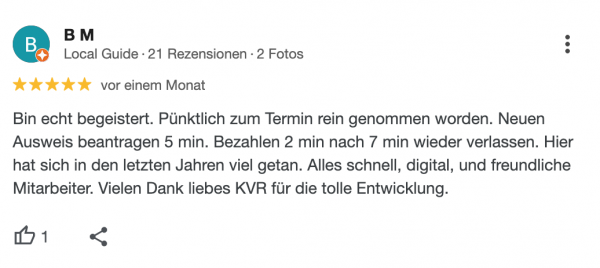 „Alles schnell, digital, und freundliche Mitarbeiter. Vielen Dank liebes KVR für die tolle Entwicklung.“
