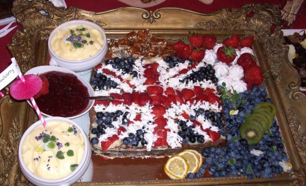 Draußen wartet schon ein Buffet auf die Schauspieler. Liebevoll hergerichtet zum Thema Großbritannien, zum Stück passend. Erst jetzt, wenn die Schauspieler da sind, dürfen auch die Premierengäste zuschlagen bei Fish and Chips, Scones und und und. Viele Komplimente gibt es für das Essen und auch für den Theaterabend. Dieser Abend wird zur Nacht, es wird geredet und gefeiert. Aber nicht zu lange, denn schon am nächsten Tag ist wieder eine Vorstellung!