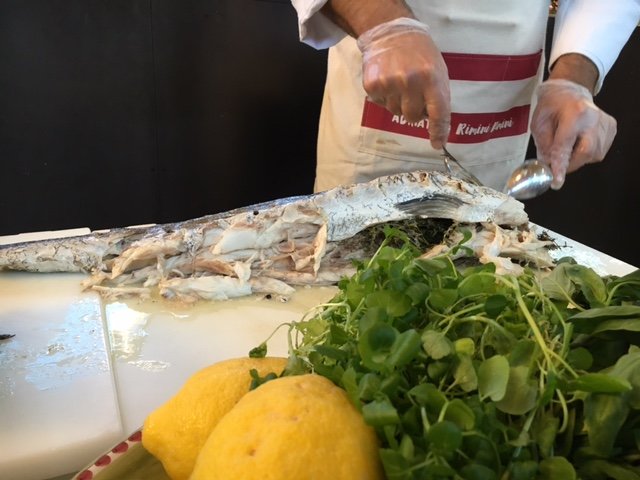Schon als wir die Treppen in den ersten Stock hochgehen, fühle ich mich nach Italien versetzt, mir kommt dieser unvergleichliche Geruch entgegen, der mich sofort an Italienurlaube erinnert. Oben werden wir mit einem Aperitif begrüßt. Ich entscheide mich für den 6PM Spritz und laufe mit großen Augen zur Vetrina: Gefüllte Paprika, Pulpo-Salat und Fisch, jede Menge Fisch. Denn um den geht es im RiminiRimini. Mit dem auf erstmal drei Monate angelegten Konzept schließt das Eataly eine Lücke: Vier Full Service Restaurants gibt es bereits, die die typischen Speisen Italiens abdecken, bspw. Pasta, Pane und Carne, gefehlt haben noch Fisch und Meeresfrüchte.