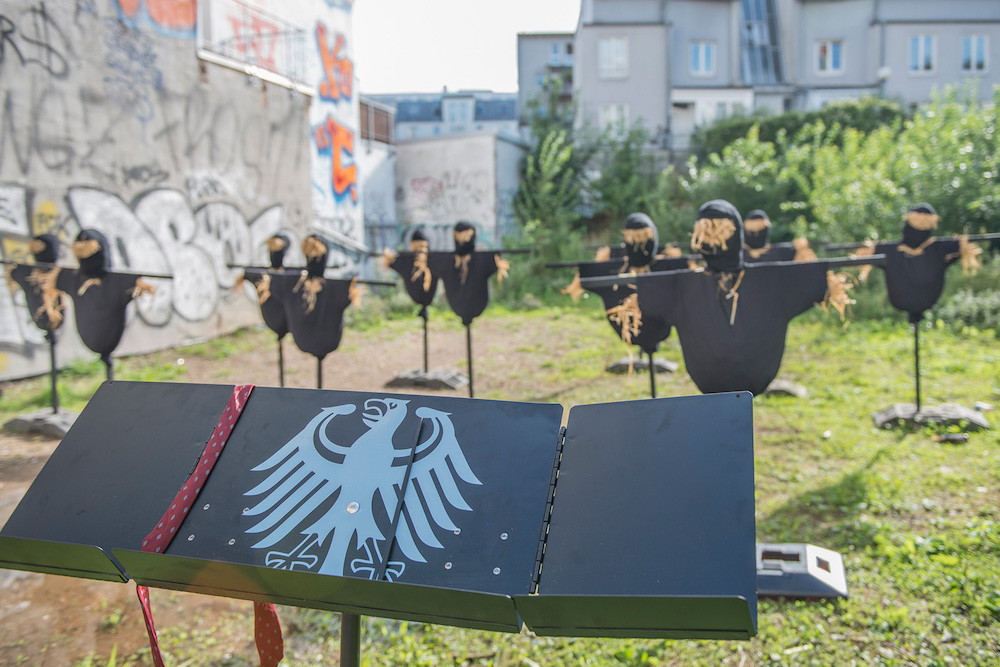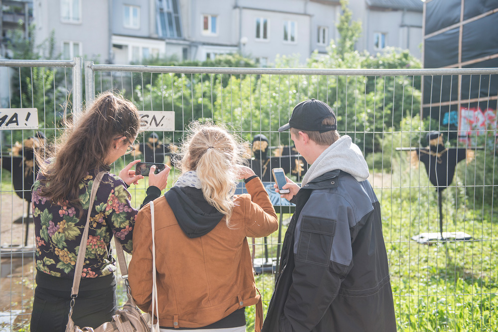 – Dieser Prozess ist eigentlich ziemlich wichtig für das Kunstwerk. Was man an dem Endprodukt jedoch nicht sieht. Also, dass wir uns selber aufklären und uns informieren und lesen und – okay, im Online-Zeitalter ist das ziemlich einfach, aber das ist auch nicht unsere einzige Quelle des Wissens. Wir machen zum Teil.. zum Beispiel Heckler & Koch, die Geschichte. Da waren wir in Oberndorf am Neckar gegen den Waffenproduzenten Heckler & Koch..