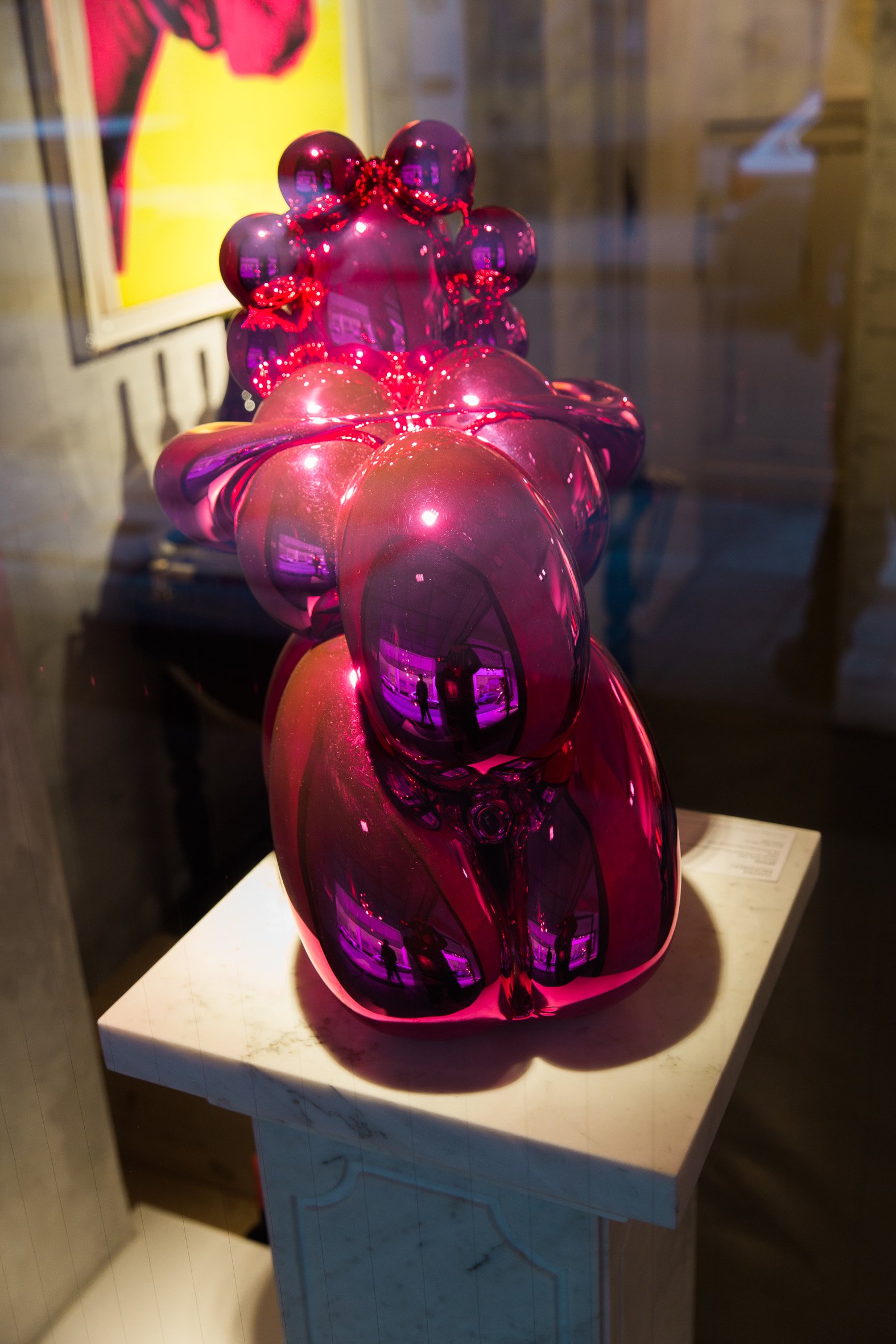 Jeff Koons Werk Balloon Venus – in einem leuchtend-glänzenden Pink – fasziniert mich besonders und somit habe ich naiv, aber zielsicher, das teuerste Werk der ganzen Ausstellung für mich als Lieblingsstück gewählt. Ich lerne, dass Koons von der Venus von Willendorf für diese Skulptur inspiriert wurde und diese auf Hochglanz polierte Oberfläche wählte, um der Gesellschaft einen Spiegel vor Augen zu halten. Zudem versteckt sich im Inneren der Skulptur eine Flasche Dom Pérignon Rosé Vintage aus dem Jahr 2003 – eine für mich sehr interessante Art und Weise eine Fruchtbarkeitsgöttin darzustellen.
