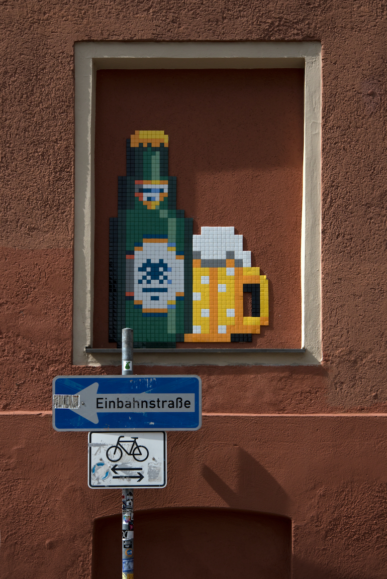 Invader was here! Rückfassade der Augustinerbrauerei im Westend, verschönert vom Streetart-Künstler