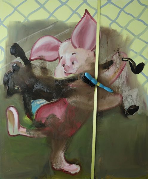 Bild: Valio Tchenkov Glitschig, 2024, Öl. Gürtel und Bürste auf Leinwand / Oil, belt, brush on canvas 150x125cm Courtesy the Artist