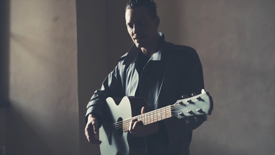 vom hereinbrechenden Sonnenlicht geradezu überflutet wird, während er sein Lied “Amber” für uns live akustisch spielt: