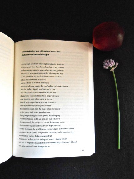 Die Gedichte hangeln sich vom Goetheplatz über die Isarbrücken zum Ostbahnhof oder aber auch nach Paris, Afrika oder Venedig. Dabei tauchen Hitler, Eichmann und Lenin auf und verschwinden so schnell wieder, wie sie gekommen sind. Prosaische Texte über Sauron im Darkroom machen Spaß und erfrischend sind die Zeilen: “und ich schaue den himbeeren/ beim tanzen zu/ wie sie ihre kleinen vaginas/ auf und zu machen/ auf und zu/ auf und zu/ auf und zu”, die von Romans Humor zeugen.