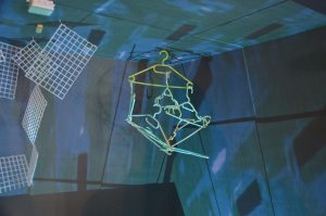 Die Garderobe ist jetzt etwas ganz Besonderes, eingerichtet vom Tam Tam Kollektiv: der Boden wurde mit Spiegeln versehen und von der Decke hängen Kunstinstallationen, eine Lampe aus Einweg-Aluminium-Grills und ein Gehänge aus bunten Kleiderbügeln.