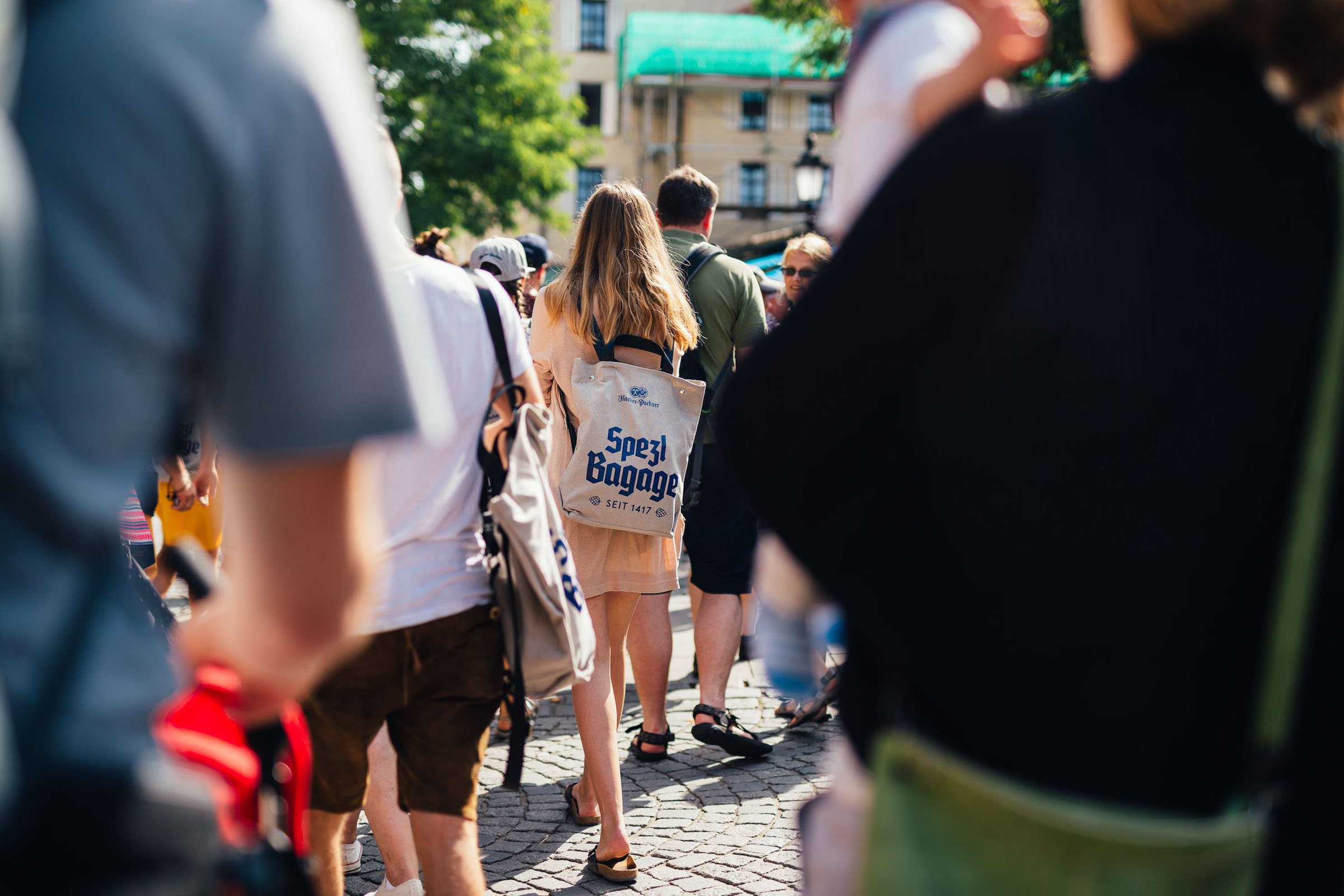 Ausgerüstet mit Spezl-Käppis, Rucksackerln und dem obligatorischen Lastenradl voller gekühlter Hacker-Pschorr Spezialitäten (flüssiger Art, versteht sich) ziehen wir los und schnell die Blicke der anderen auf uns. „Gibts da was umsonst?“ „Was seits denn ihr?“ Spezl sammer, blöde Frage, ja so schnell kann des gehen, darauf erstmal Prost.