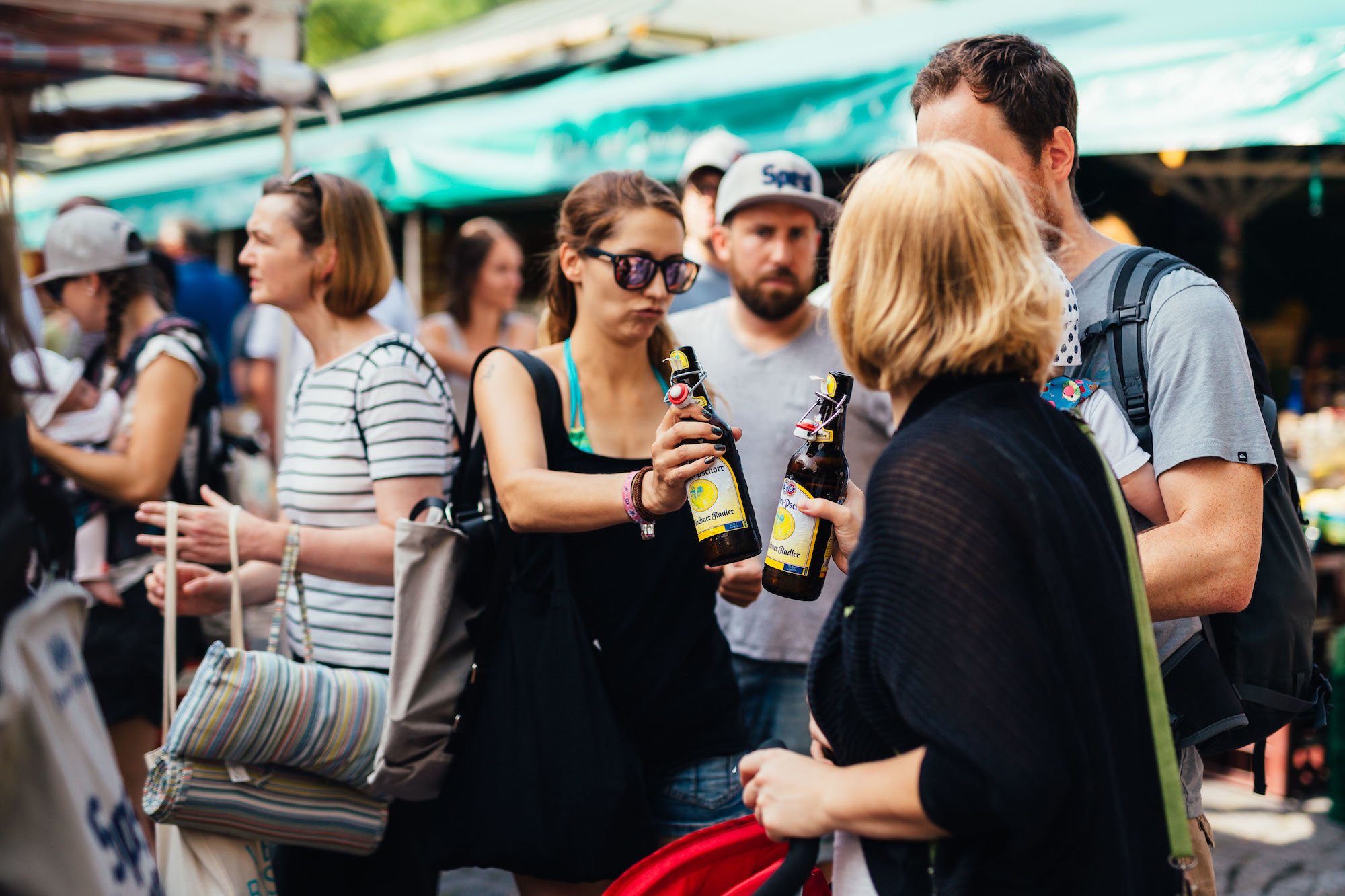Es ploppt von links und rechts, Gedrängel am Lastenfahrrad – halt!, das Gselchte hab ich aber noch nicht probiert! Die Lederhosn vom Opa trifft auf Hipster-Schnauzer und Tattoos, Evi rückt die Spezl-Käppi zurecht, die Sonne brennt erbarmungslos vom Himmel, 27 Grad am frühen Vormittag, Sommer in München.