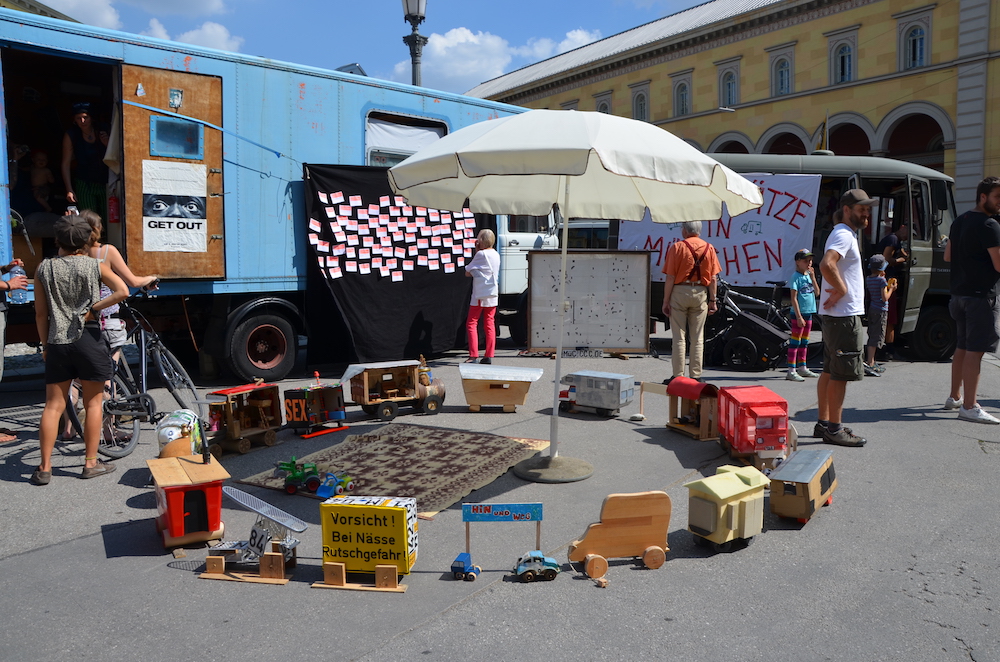 Lange hat es nicht gedauert, bis sich die drei Bauwägen letzte Woche auf dem Max-Joseph-Platz formiert haben. Lange hat es auch nicht gedauert, bis sich die erste Menschentraube davor bildete. Ist ja auch ein interessanter Kontrast, so ein Mini-Wagendorf zwischen Residenz und Staatsoper, am Anfang der schicken Maximilianstraße.
